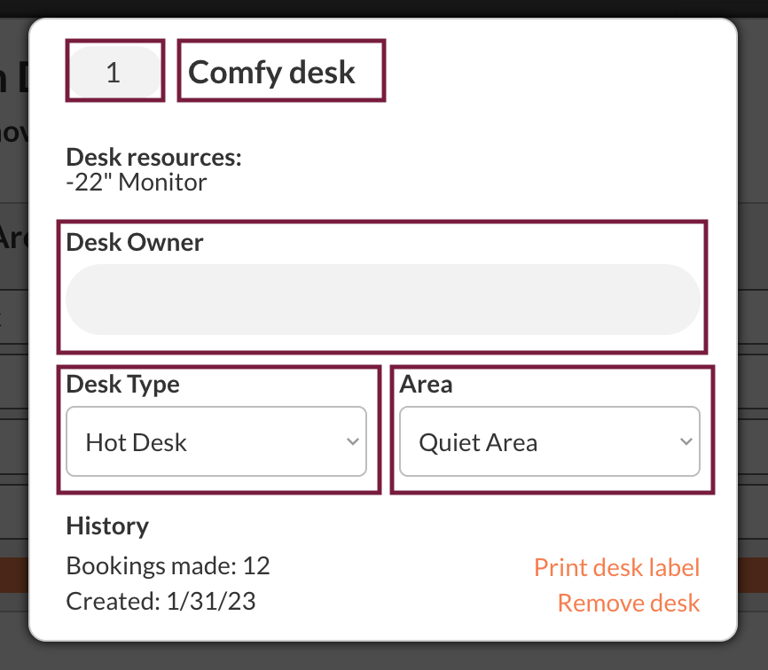 Here you can change the desks order number, name, owner, type and area. You can also see the history of that desk.