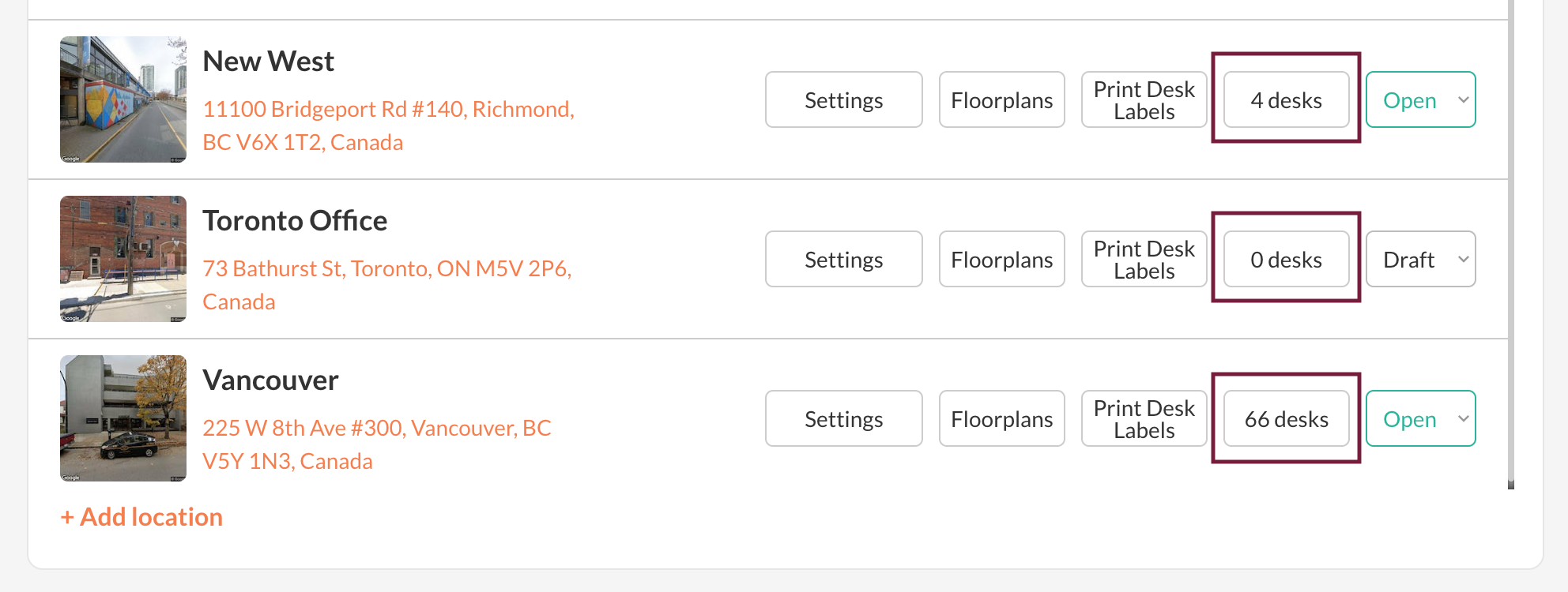 Method 2. Navigate to Settings page by clicking on your profile image and press "Settings". Open "Locations" tab. Scroll down and find a location that you would like to setup desks for.
