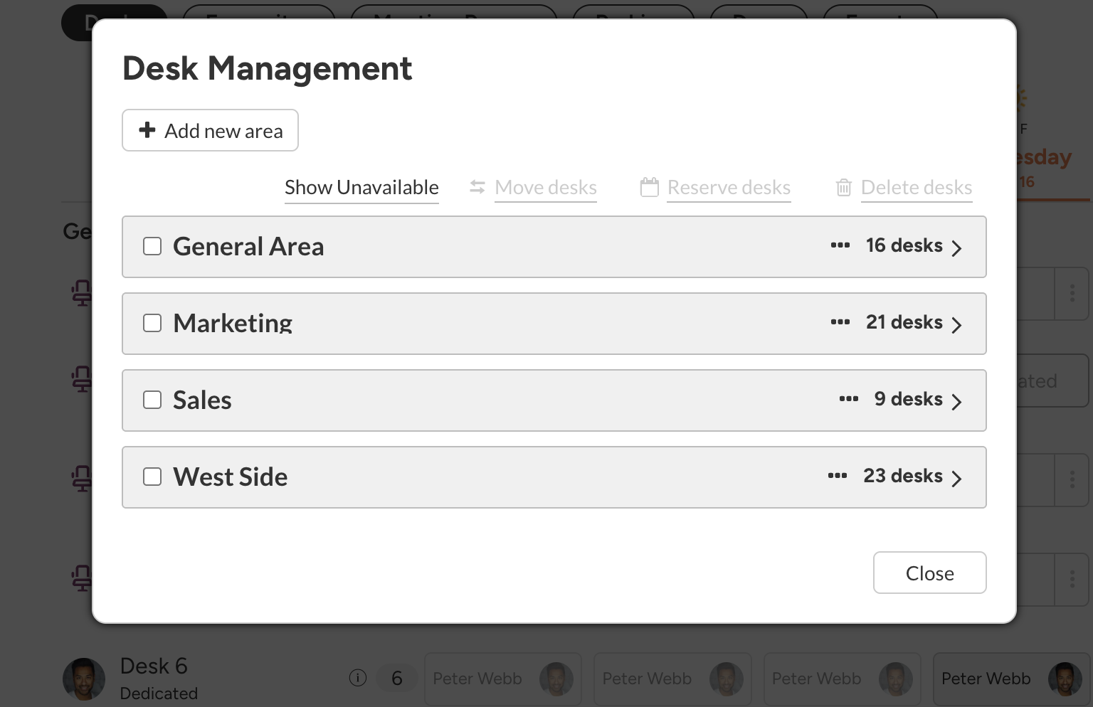Here you can rename the area by clicking on it's name. You can also re-arrange desks by drag-n-drop.