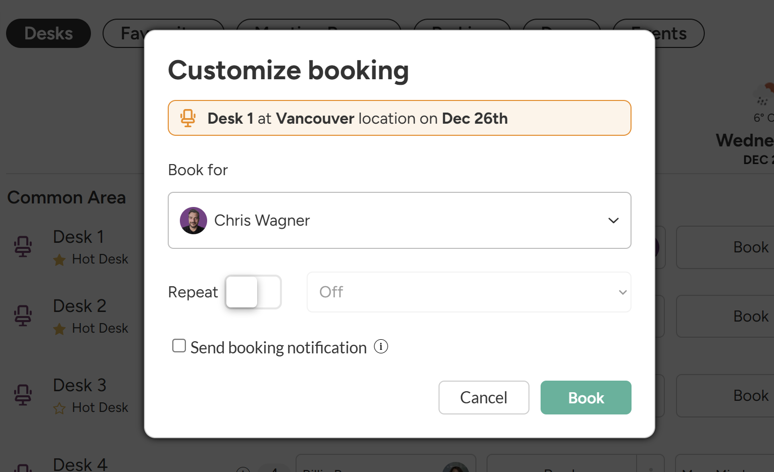 The Customize Booking pop-up allows you to make a booking for another team member and add repeat options.