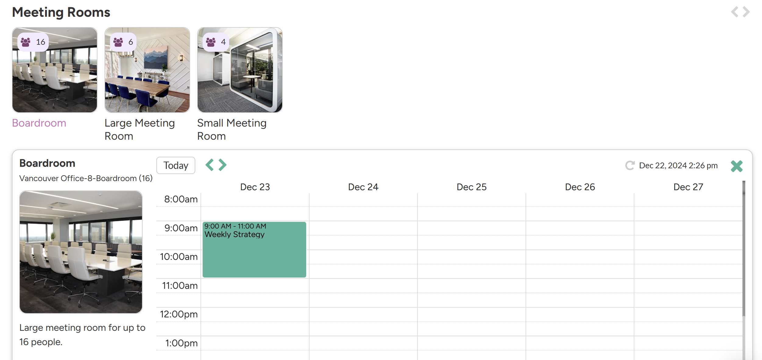 If your company has meeting rooms enabled, you will see the option to book Meeting Rooms. This is integrated with your organization's Google calendar so any meeting rooms you book in Google Calendar will appear in Deskfound. In turn any meeting room bookings you make in Deskfound will appear in Google Calendar.
