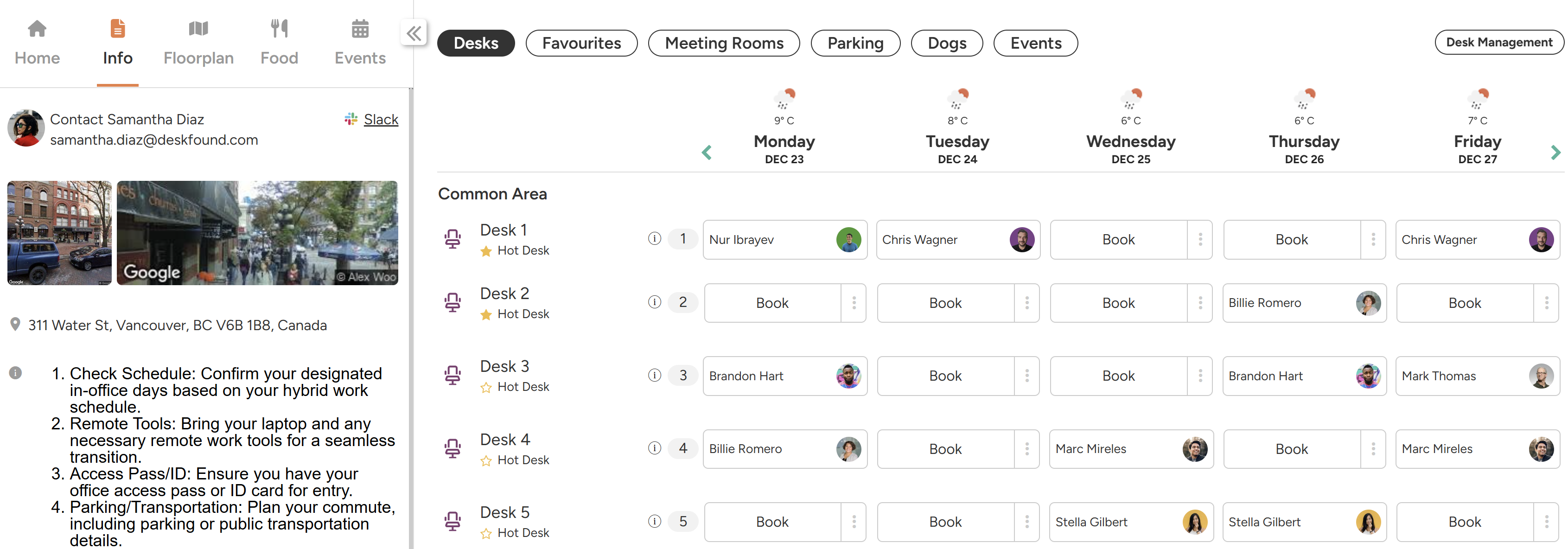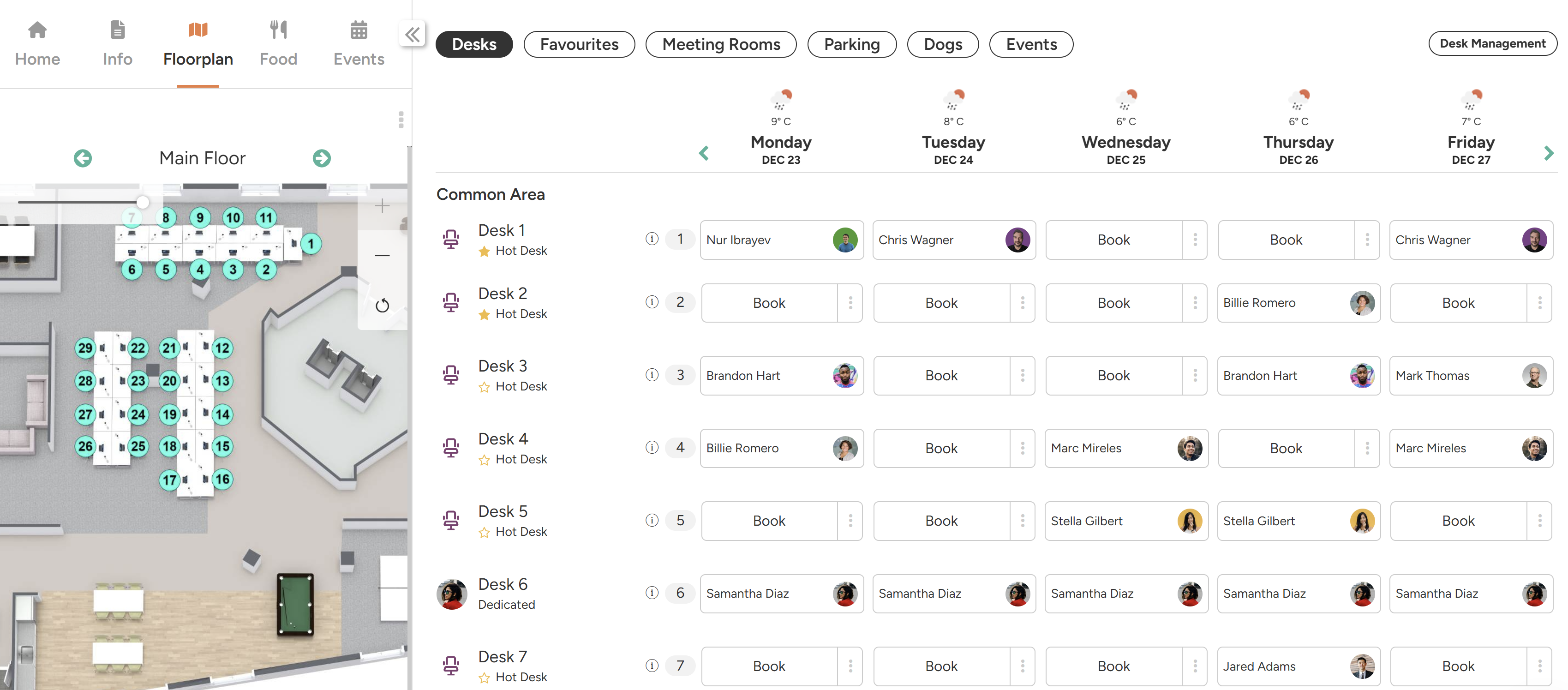 You can use the weekly booking view to see what desks are booked and make your own bookings.