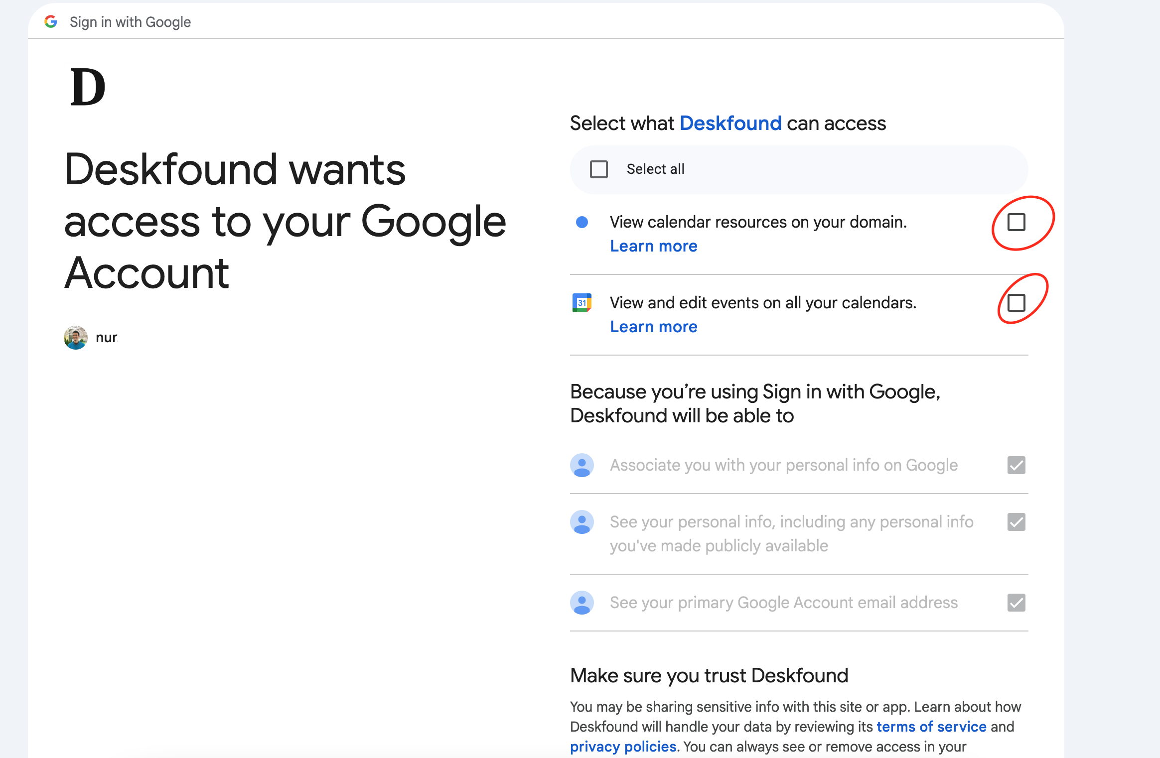 Updated over a year agoIf you notice that your meeting room events created in your calendar or events created in Deskfound don't synchronize between your calendar and Deskfound, chances are you haven't granted Deskfound the required permissions (scopes in Google lingo), indicated by error codes 401 or 403. The two required scopes are: